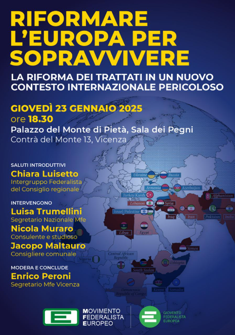 La riforma dei trattati dell’unione europea e in generale il punto della situazione della crisi di identità e di prospettive in Europa era il tema dell’incontro organizzato dalla sezione di Vicenza del MFE, il Movimento Federalista Europeo. Tema che si è dimostrato di grande interesse vista la numerosa partecipazione. Sala dei pegni del Monte di Pietà gremita ieri alle 18.30. Enrico Peroni, segretario del MFE di Vicenza, ha introdotto la serata ricordando, citando il il recente discorso di Zelensky a Davos, che il futuro dell’Europa è il futuro di tutti noi presenti che ora stiamo guardando tutti a Washington ma dovremmo invece guardare a noi e al mondo che vivremo che è in continuo cambiamento.