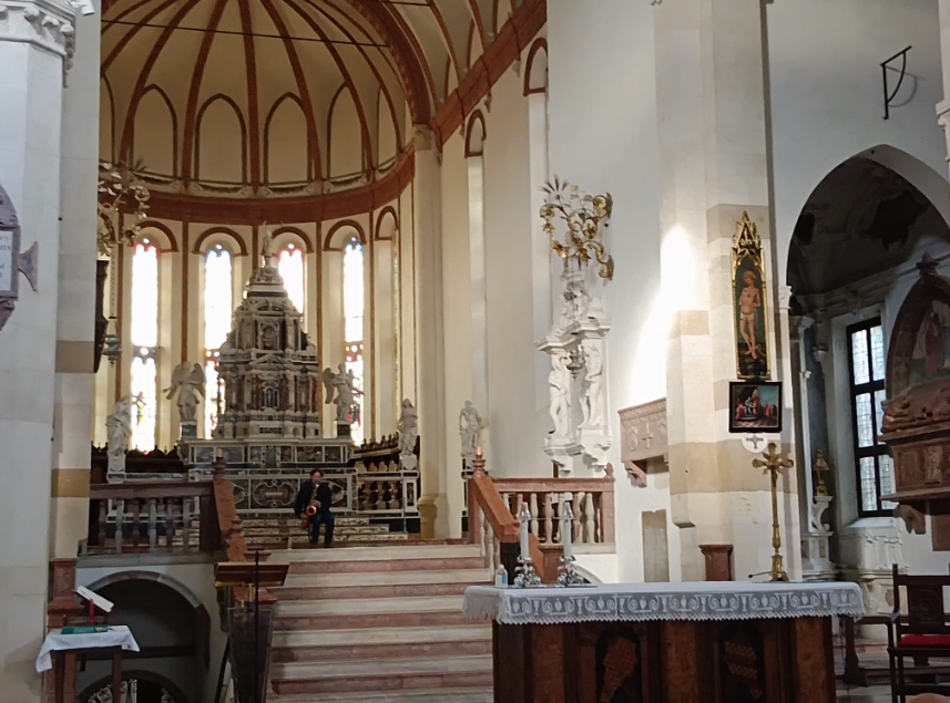 Dimitri Grechi Espinoza nella straordinaria cornice della Chiesa di Santa Corona (che meraviglia sentire musica nelle chiese) ci ha portato la teoria tradizionale indù sulla risonanza (dhvani) e sulla primordialità del suono, espressa attraverso i concetti di ahata nada (suono udibile) e anahata nada (suono non udibile). Lo ha fatto col progetto OREB (nome del luogo dove il profeta Elia incontra la voce di Dio) che esprime, col sax dell’autore, una “voce di silenzio sospeso”, appena percepibile all’udito, che è la voce di Dio e quella nostra interiore, che è il suono udibile e quello inudibile.