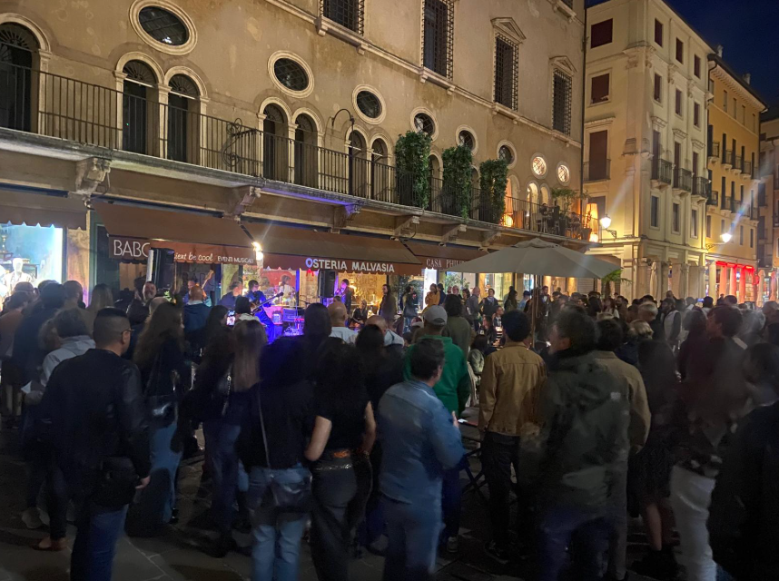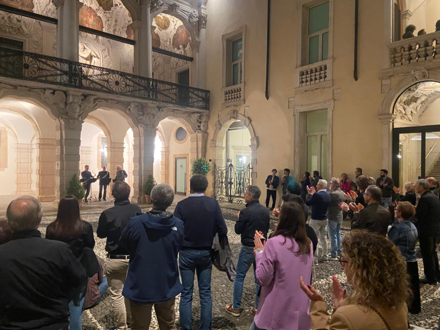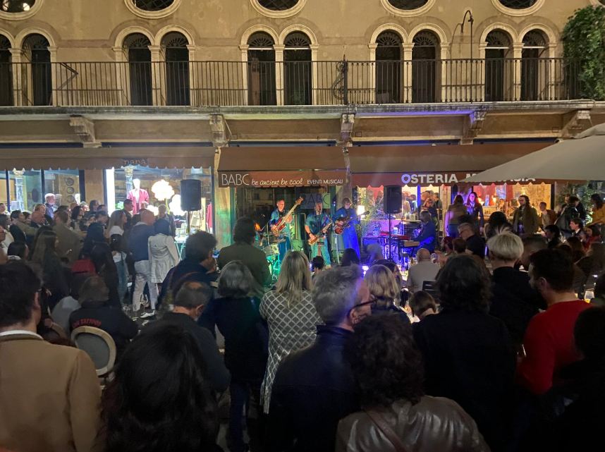 Un’esperienza in cui trattenere il fiato diventa partecipare ad un altro respiro, umano e non umano. Astratto, con battiti del cuore lentissimi. Tanto che uscire e ributtarsi nell’affollatissimo sabato pomeriggio è stato uno shock di rumori. Piccola digressione in piazza. Oggi era anche la giornata dei musei, grazie all’impegno della Fondazione Roi. Palazzo Thiene, Museo Diocesano, Palladio Museum e Palazzo Leone Montanari, diventavano palcoscenici per altrettanti concerti, insieme a quel palco naturale che è la Loggia del Capitaniato dove, per tutto il pomeriggio, si svolgeva il Thelonious school day, dedicato agli studenti della ormai storica scuola di musica vicentina.