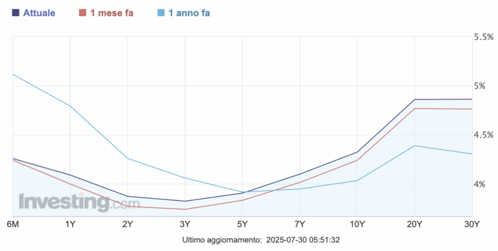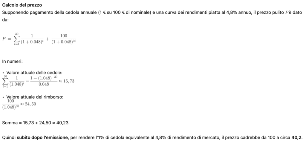 Il Tesoro può anche emettere un trentennale all’1%, ammesso e concesso che qualcuno lo compri, il primo giorno di quotazione scenderebbe a 40. Una bellissima svalutazione del 60% in conto capitale per chi lo ha sottoscritto (verosimilmente fondi pensionistici o piattaforme di stable Coin grazie al Genius Act? Chiedo per un amico)