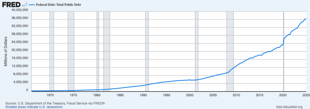 Iniziamo dall’elefante nella stanza: il debito americano. Nel momento in cui scrivo ammonta a 36.770 miliardi di dollari (trentaseimilasettecentosettanta). Il PIL è di 27.720 miliardi. Dati ufficiali della FED. Gli USA sono usciti dalla crisi finanziaria globale indebitandosi e hanno continuato a indebitarsi per mantenere alto il tenore di vita e gli stipendi. Un picco importante lo si nota durante la pandemia. (Vedi immagine)