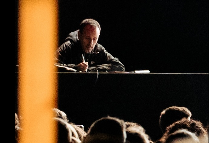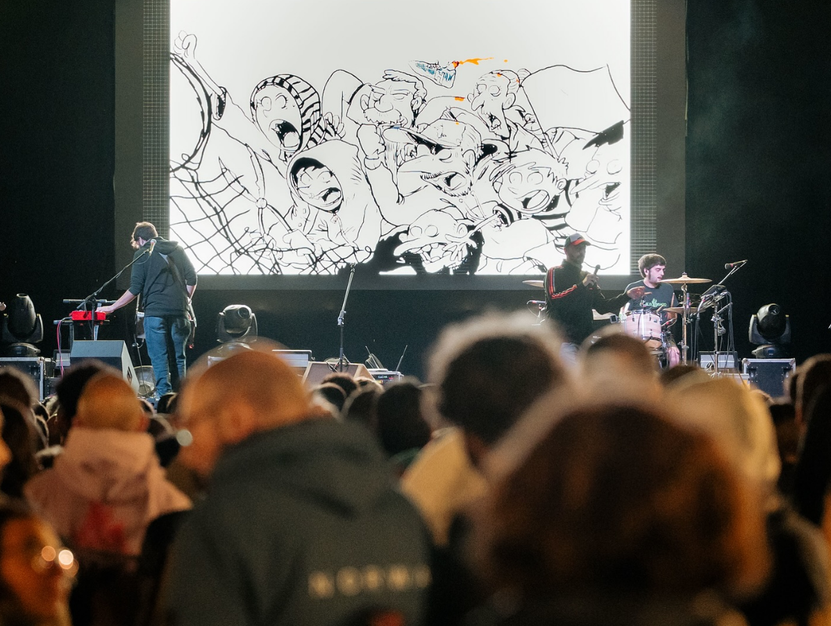 Giovedì venticinque settembre duemilaventicinque, festival Hangar Palooza, primo di 4 giorni dove si sarebbe mescolato yoga all’alba con dj set fino a notte fonda, si inaugura la sarabanda con una scommessa, un concerto a pagamento, venti euri per entrare a sentire e vedere Giancane e Zerocalcare – Michele Rech per gli atti notarili – che mentre Gianca suona, scarabocchia dal vivo, un disegno dopo l’altro proiettato sullo schermo come in un film muto. Non è uno spettacolo, è un’alchimia da strada, un “concerto disegnato” che i due hanno forgiato nei solchi di “Strappare lungo i bordi”, quella serie animata che in qualche modo ora rivive qui, nel ventre del parco della pace. Zerocalcare prende le note di Giancane e le fa sbocciare in vignette: mostri con la cravatta che inseguono eroi precari, armadilli che ballano twist su nuvole di fumo, e Roma – sempre Roma, con i suoi sampietrini traditori – che si trasforma in Vicenza per un attimo. Ad un certo punto compare la scritta “No Dal Molin” perché il ragazzo sa bene dov’è ed è giusto così. La scommessa è vinta. Ci sono quasi 2.000 persone ed è il primo concerto nella storia del Teatro Comunale di Vicenza organizzato fuori sede dalla Fondazione. La città ha risposto alla grande. Sebbene l’inaugurazione sia stata due giorni dopo, si può dire che quella “vera” sia questa, quella del popolo. Zerocalcare, con quel understatement da chi ha visto troppi mostri sotto il letto, non parla molto – lascia che il pennarello chiacchieri per lui. Ma nei suoi schizzi c’è tutto: anche la malinconia di un Veneto che ha detto no alla guerra in giardino, l’ironia di chi disegna draghi per esorcizzarli, e un’eco del da poco scomparso Stefano Benni, perché qui le storie non sono dritte come autostrade, ma curve come i canali del parco, piene di conigli parlanti e di nuvole che piovono fumetti. Giancane canta di amori ipocondriaci, e Zero li illustra con cuori che paiono motori grippati. Mentre la notte avvolge il parco come un plaid logoro, con le stelle che strizzano l’occhio agli aquiloni del giorno dopo, Zerocalcare si concede ad un firmacopie lunghissimo, generoso, felice. Non è stata solo una serata: è stata una vignetta viva.