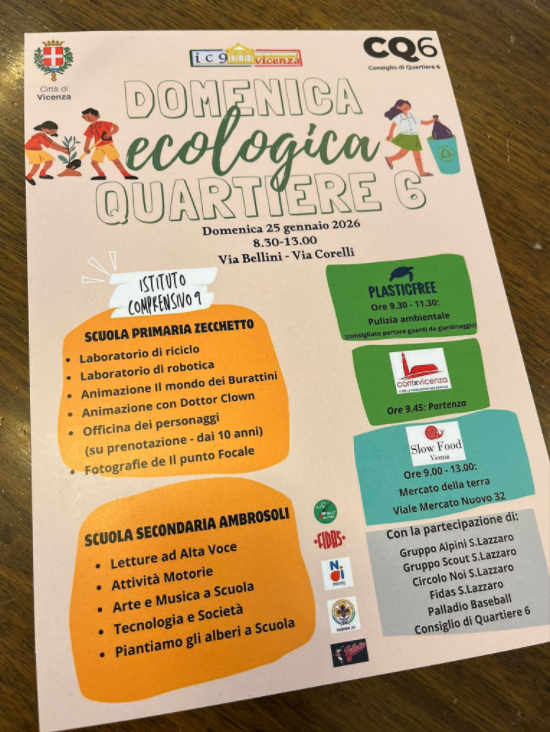 Prevista la pulizia ambientale “Plastic Free”, per bambini e genitori, ragazzi e volontari, con ritrovo alle ore 9.30 nel tratto chiuso alla circolazione, in via Bellini, nel tratto compreso fra l’intersezione con via Albinoni (a nord) e l’ingresso del parcheggio posto all’altezza dei civici 92-88 della stessa via Bellini, e in via Corelli, nel tratto compreso fra l’intersezione con via Bellini e l’intersezione con via Mons. Onisto. Ristoro finale con cioccolata calda e tè, a cura degli alpini del “Gruppo San Lazzaro”; Torna anche CorriXVicenza, con ritrovo alle ore 9.30 nel tratto chiuso alla circolazione e ristoro finale con cioccolata sempre a cura degli alpini del “Gruppo San Lazzaro”; spazio anche alle attività e laboratori per i bambini della scuola primaria Zecchetto: Laboratorio di riciclo: dal nulla nascono meraviglie, Laboratorio di robotica, curato dall’associazione genitori, Animazione “Il mondo dei burattini”, con Franco Mastrovita, Animazione “Dottor Clown” con l’ambulanza magica, giocoleria e spettacolo, Laboratorio di modellazione creta “Officina dei personaggi” per ragazzi a partire dai 10 anni – su prenotazione – a cura dell’Associazione Numa, con Silvano Beggio, set fotografico dedicato alle famiglie con “Punto Focale”; previste anche attività e laboratori per i ragazzi della scuola secondaria Ambrosoli: Letture ad alta voce, a cura degli alunni della scuola, Attività motorie in palestra, Arte: laboratorio artistico, Musica: esecuzione di alcuni brani musicali, Tecnologia e società: nel cortile della scuola gli alunni illustreranno i murales dedicati ai caduti per mafia, Tecnologia e società: gli alunni esporranno progetti di riqualificazione del parco attiguo alla scuola; le scuole “Zecchetto” ed “Ambrosoli” saranno aperte e visitabili da tutti i cittadini.